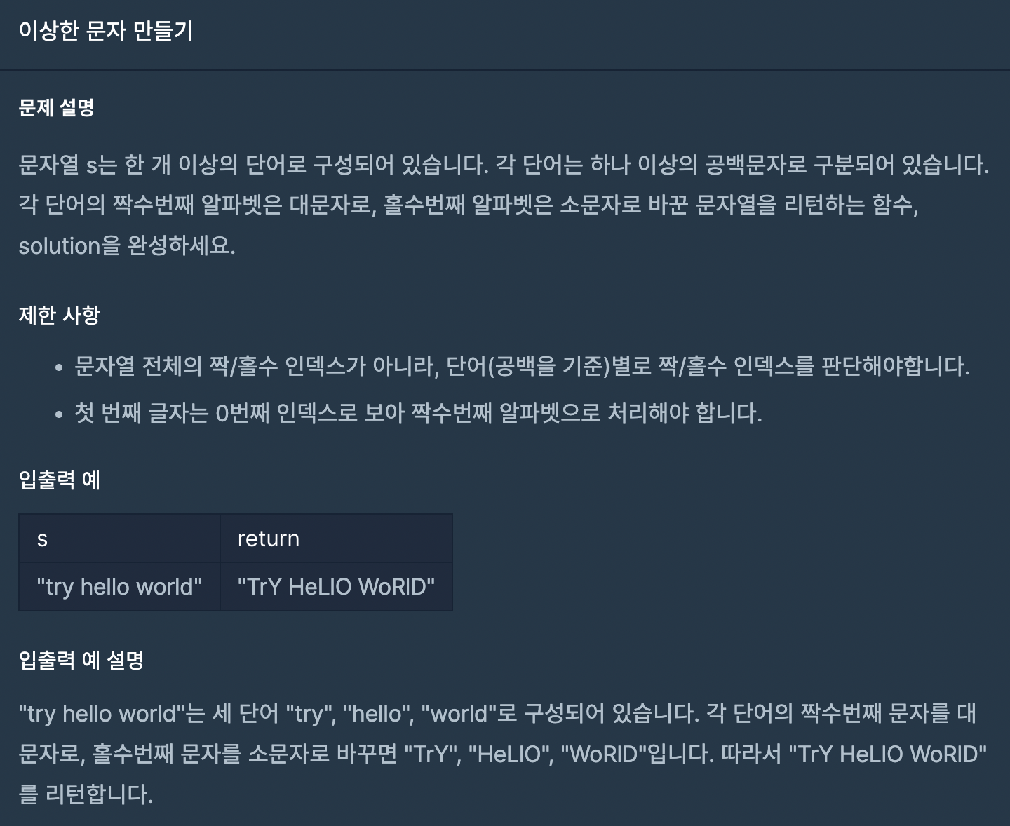 split(" ")을 사용해 문자열로 들어온 매개변수를 배열화 시켜서 "try", "hello", "world" 형태로 만들어줬다.