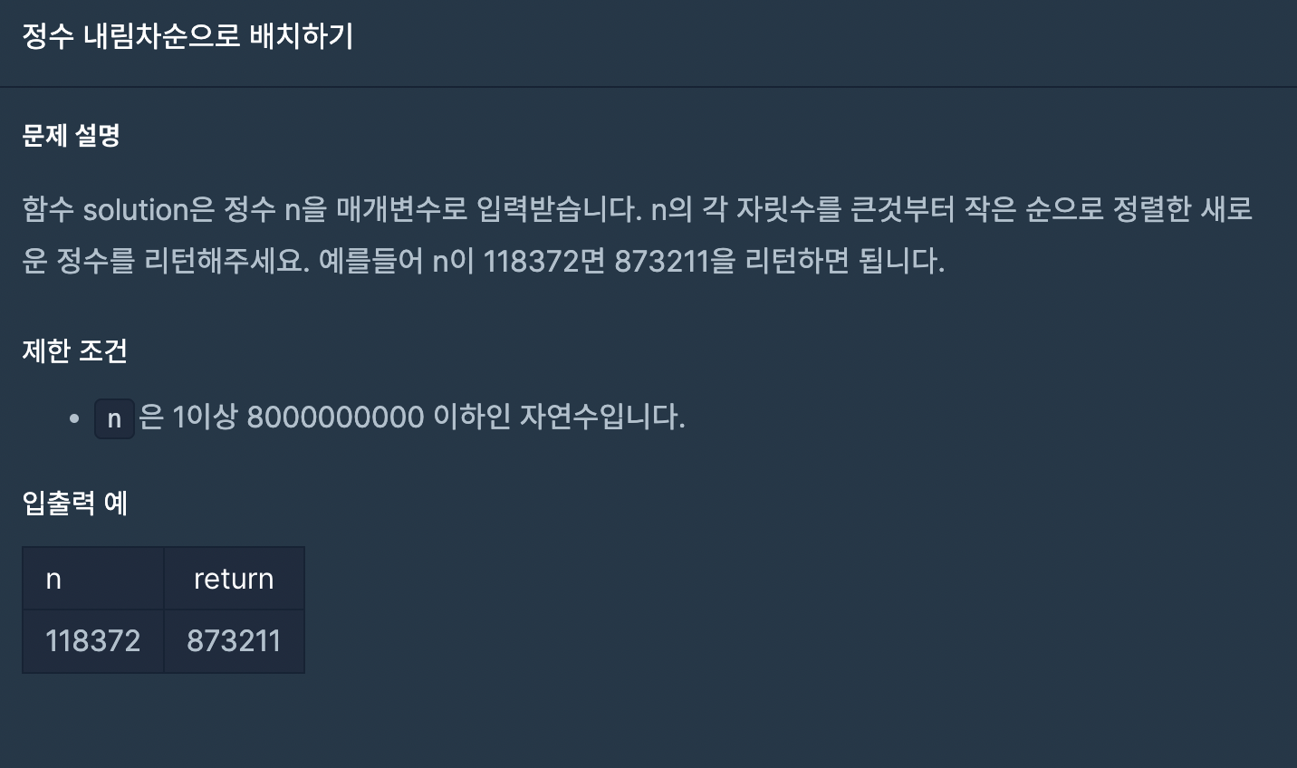n + "" 을 사용해 문자열로 바꿔주고 split("")을 사용해 배열화 시킨후 sort() 메소드를 사용해 오름차순 정렬 후, reverse()로 배열 순서를 뒤집어줬다. 그 후 join("")을 사용해 배열의 요소들을 하나의 문자열로 합쳐준 후 모든 내용을 parseInt로 감싸 숫자 형변환을 해서 리턴하게 했다.