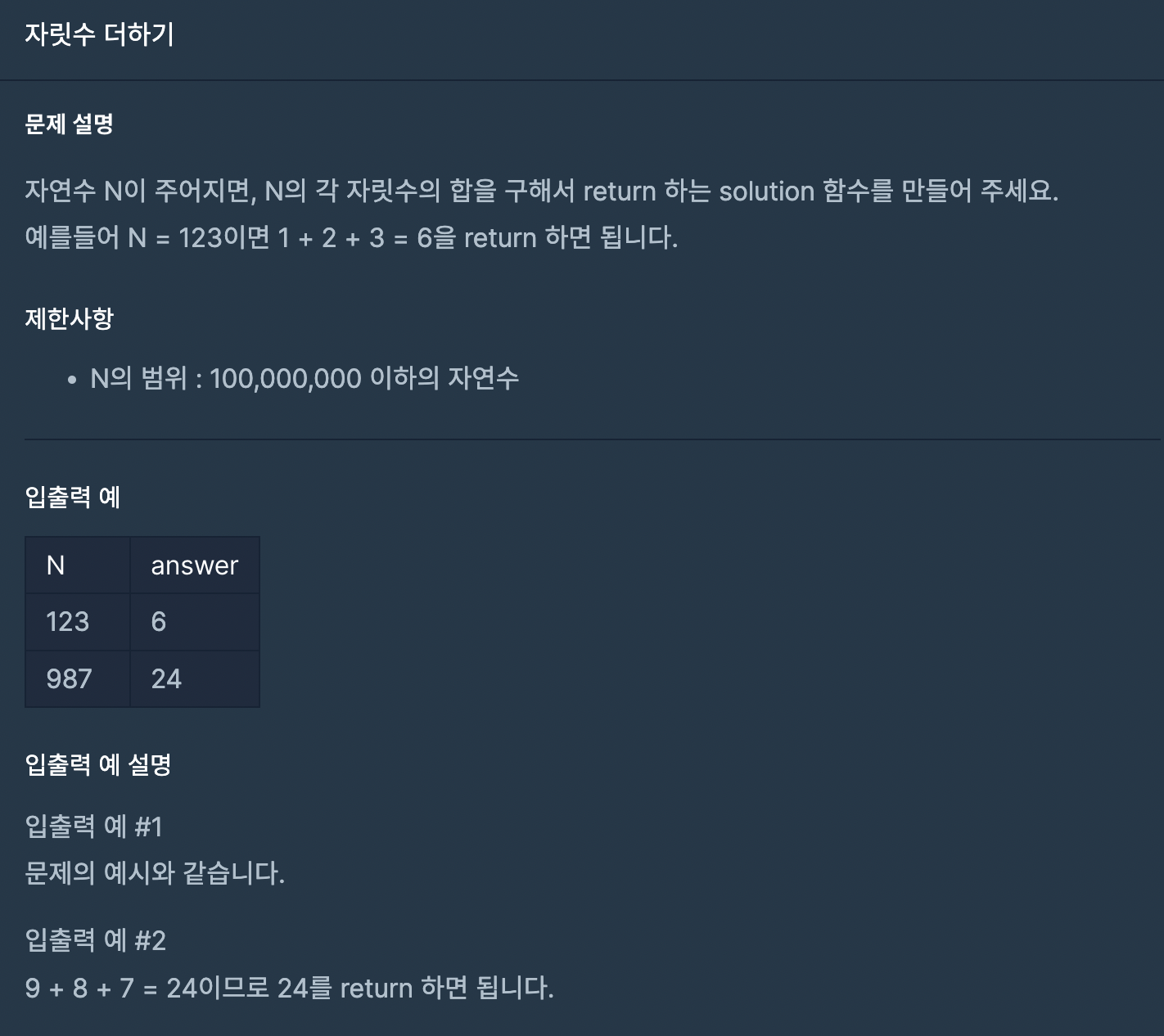 먼저 매개변수 x를 문자열화 시킨 후 배열화 시켜서 arr 에 할당한다. 그 후 변수 sum에 arr 배열의 모든 값을 더한다. 이때 a와 b에 1을 곱해주는 이유는 number로 형변환을 시킨 후 더해주기 위함이다.