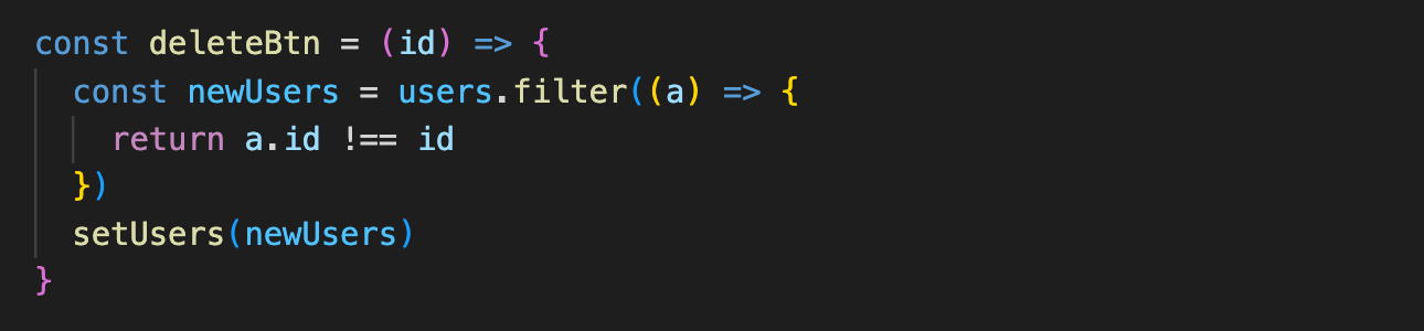 filter() 함수를 썼는데 동작 원리를 설명해보면 버튼을 눌렀을 때 매개변수로 보내준 item.id(삭제 버튼을 누른 카드의 id)와 users의 모든 값을 순차적으로 a에 담아 a.id와 비교해서 id와 다른 값만 리턴한 것을 newUsers에 담아서 setUsers(newUsers)을 통해 값을 변화시켰다.