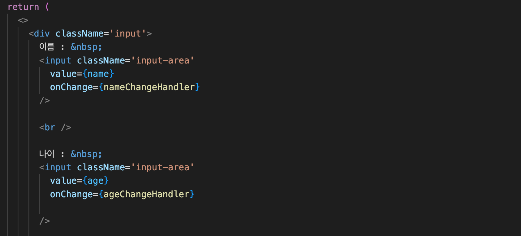 이름과 나이를 입력 받는 input을 만들고 입력되는 값인 value를 {age}로 설정했고, onChange 이벤트(입력되는 값이 변화될때마다 작동)를 사용해 각각 함수가 작동되게 했다.
