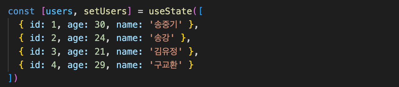 그 후 스프레드 문법을 통해 users를 해체 시켜주고 새로 만든 newOne를 추가해 다시 배열로 감싸주면 기존 배열에 newOne이 추가된다. 이 방법을 통해 불변성을 지킨 것이라고 볼 수 있다.
