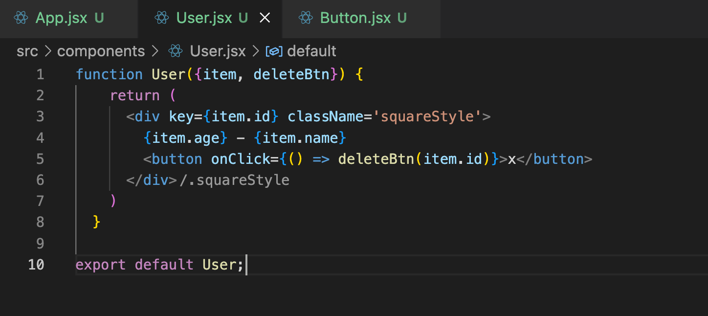 파일을 분리한 User.jsx에서 {item, deleteBtn}을 받고 나이와 이름을 출력해준다. 그 후 분리한 파일에서 위 코드의 마지막 줄과 같이 export default User를 해준다.