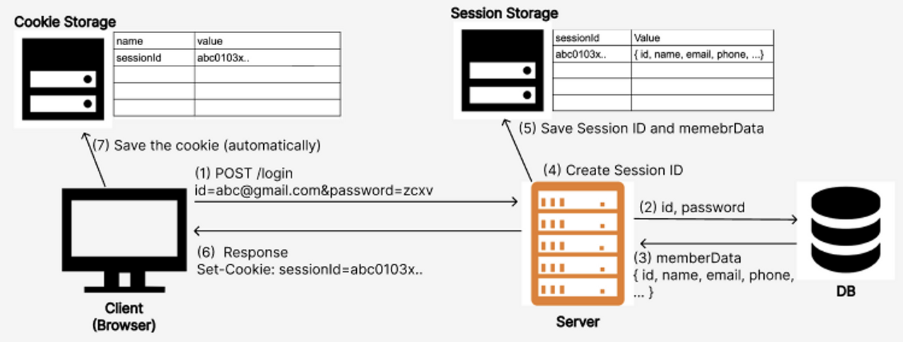 - 로그인 성공 → 서버에서 세션 생성 및 저장(key-value 형식) → key(sessionId)를 브라우저에 응답(by 쿠키)