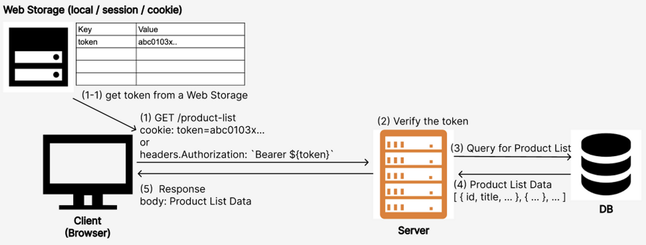- 웹에서 인증 수단으로 사용되는 토큰은 주로 JWT (Json Web Token) 을 이용한다.